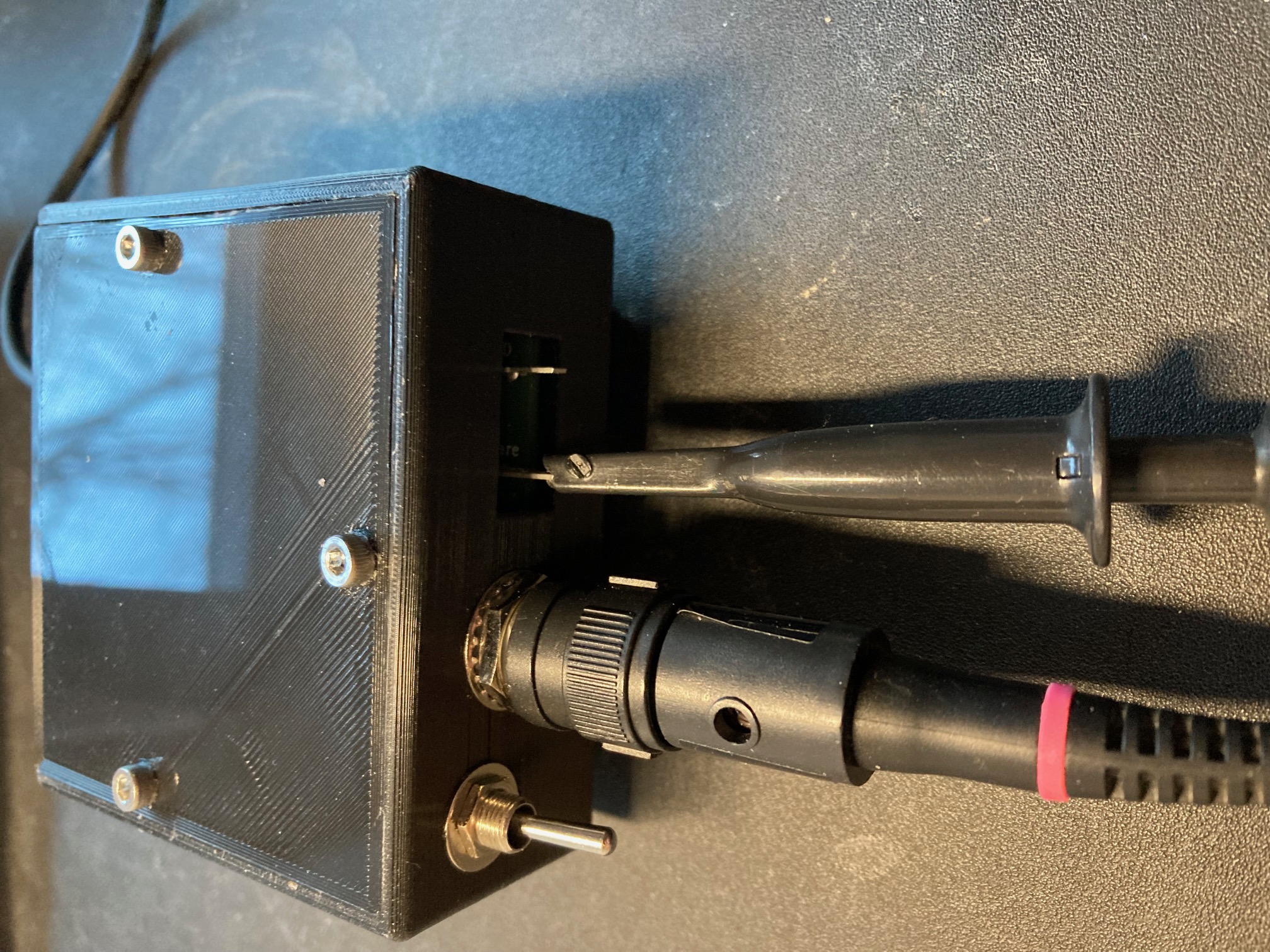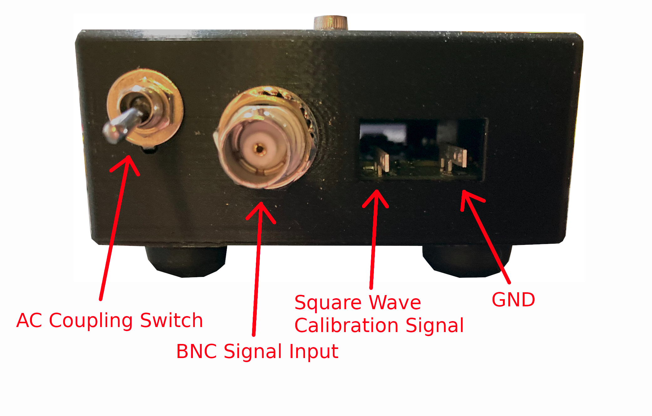 The NS1 has a square wave generator built into its front panel for calibration and test purposes. To look at this signal, attach your probe as shown. The ground lead is not necessary as the square wave generator is already referenced to the scope ground. To start, make sure your probe is set to 1X mode. This is done with the switch on the side.